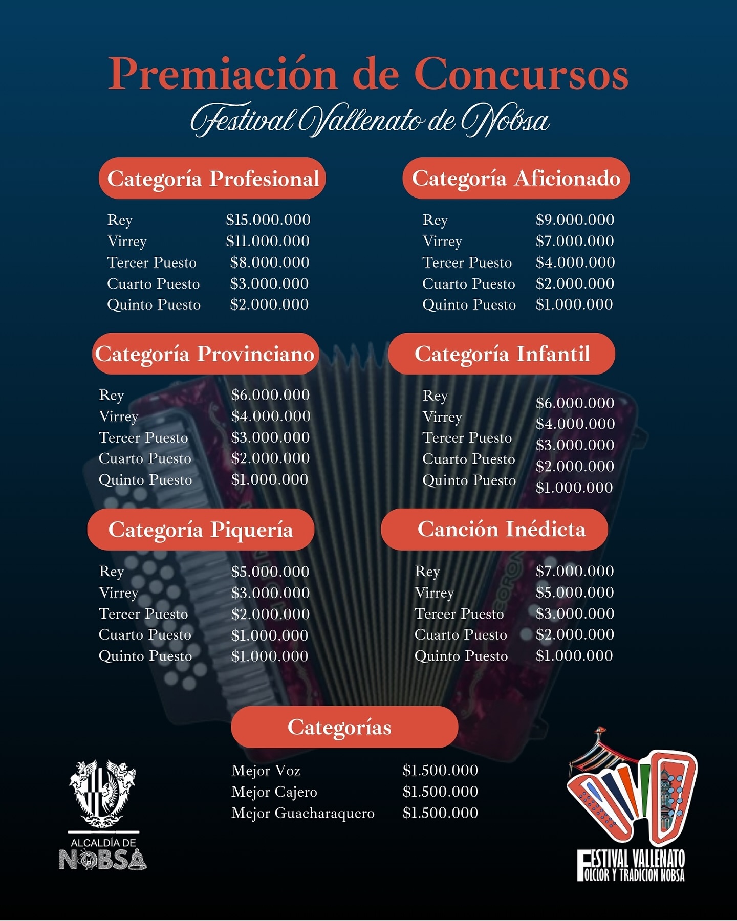El Festival Vallenato de Nobsa dio a conocer la premiación oficial para sus diferentes concursos, reafirmando su compromiso con el talento, la cultura y la tradición vallenata que caracteriza a esta celebración.